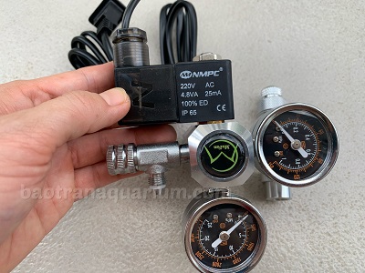 - Khóa van tinh chỉnh, lắp van điện Mufan vào van tổng của bình Co2.