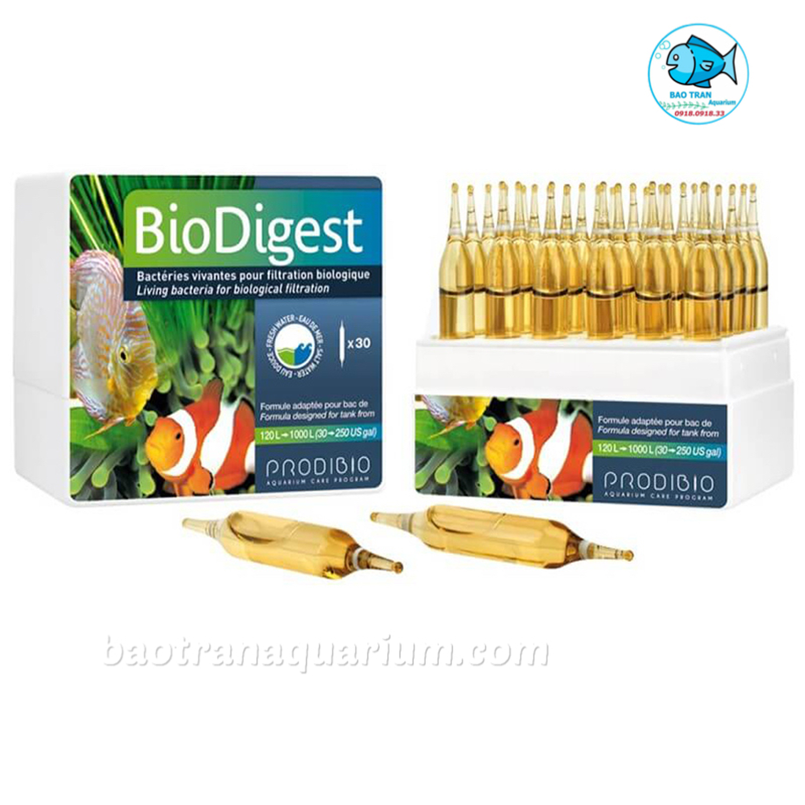 - Prodibio Biodigest bổ sung vi sinh sống cho hồ cá, khử Nitrate và Phosphate, giúp ngăn ngừ sự lây lan các loại rêu hại, đặc biệt là rêu tóc, khử các tạp chất dư thừa trong hồ cá . Giúp khởi tạo một hệ vi sinh hoàn chỉnh trong hồ, đẩy nhanh chu trình chuyển hóa từ Amoniac thành Nitrite, từ Nitrite thành Nitrate và từ Nitrate thành Nitrogen .